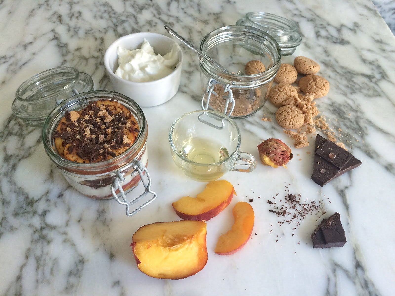 Alternate gli amaretti, le pesche, lo yogurt e il cioccolato fino all'orlo del vasetto terminando con un ultimo strato di pesche spolverate con il cioccolato.